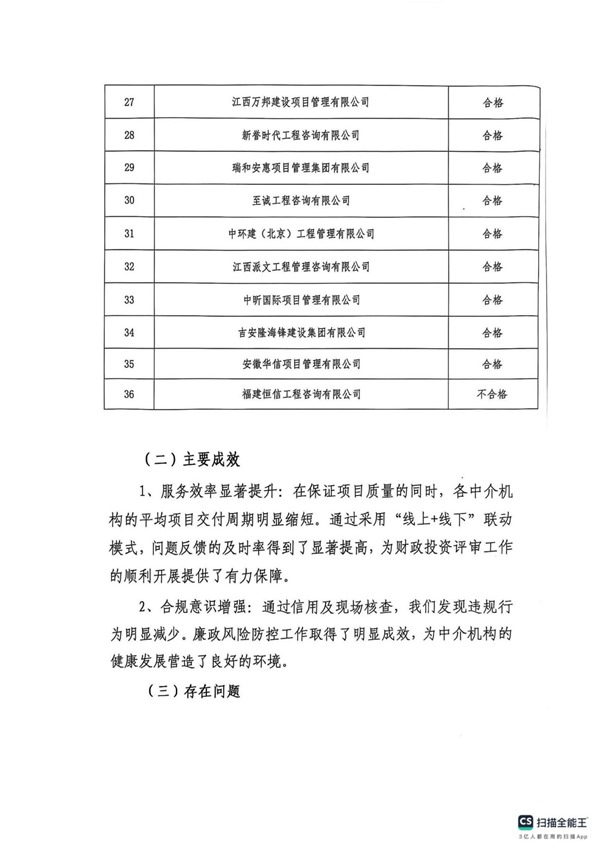 本次考核覆盖36家中介机构,重点评估了各单位的专业能力、合规性、服务质量等方面。我司在项目评审中表现突出,能够高效完成任务,严格遵守评审规范,在项目评审中能够迅速准确的把握问题导向,提出切实可行的解决方案。在制度管理方面,档案管理规范及各项考核指标均达到优秀标准。