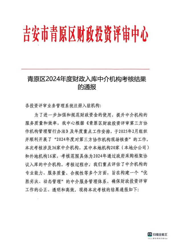 近日,青原区财政投资评审中心公布了2024年度财政入库中介机构考核结果,我司凭借扎实的专业能力和优质的服务质量,以94.49分的成绩位列优秀机构,排名首位。